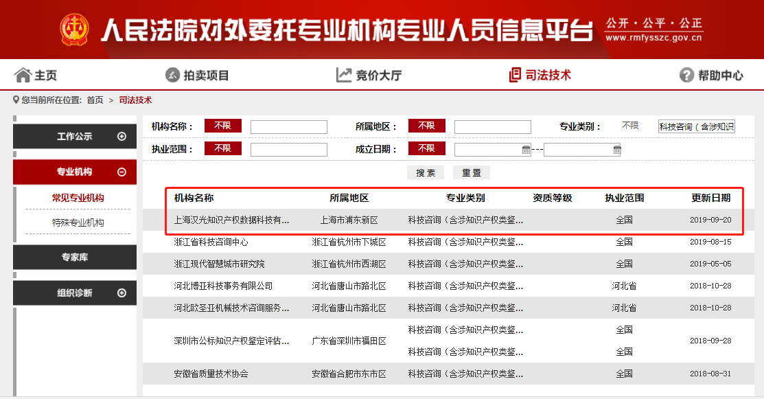 ?????? 目前,人民法院訴訟資產(chǎn)網(wǎng)審核通過的科技咨詢(含涉知識產(chǎn)權(quán)類鑒定)類目的專業(yè)機構(gòu),全國僅有七家。