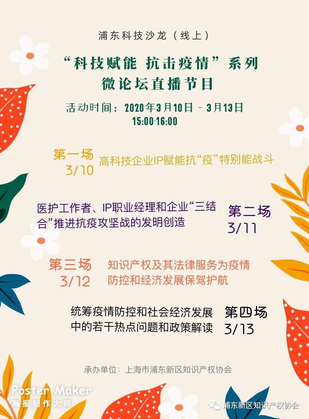 3月10日至3月13日,由上海市浦東新區(qū)知識(shí)產(chǎn)權(quán)協(xié)會(huì)承辦的“科技賦能,抗擊疫情”系列微論壇(共四場(chǎng))圓滿舉辦。值此疫情防控的特殊時(shí)期,此次論壇圍繞“高科技企業(yè)IP賦能抗‘疫’特別能戰(zhàn)斗”、“醫(yī)護(hù)工作者、 IP職業(yè)經(jīng)理人和企業(yè)“三結(jié)合”推進(jìn)抗疫攻堅(jiān)戰(zhàn)的發(fā)明創(chuàng)造”、“知識(shí)產(chǎn)權(quán)及其法律服務(wù)為疫情防控和經(jīng)濟(jì)發(fā)展保駕護(hù)航”、“統(tǒng)籌疫情防控和社會(huì)經(jīng)濟(jì)發(fā)展中的若干熱點(diǎn)問(wèn)題和政策解讀”四個(gè)主題進(jìn)行探討,邀請(qǐng)到高科技企業(yè)代表、知識(shí)產(chǎn)權(quán)服務(wù)機(jī)構(gòu)負(fù)責(zé)人、律師、高校學(xué)者等嘉賓參與。