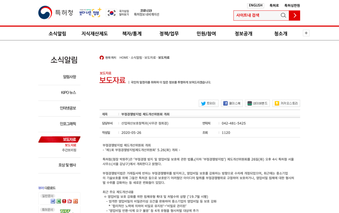 第一屆反不正當競爭法制度改善委員會議于5月26日(星期三)召開——專利廳廳長樸原住26日在專利廳首爾辦公室主持召開了“反不正當競爭行為及商業秘密保護法律”(以下簡稱反不正當競爭法)制度改善委員會議。