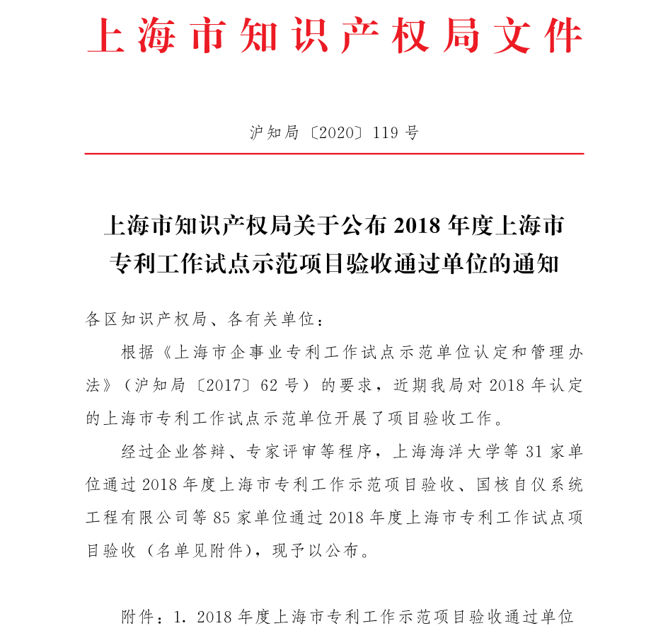 近期,上海市知識產權局公布了2018年度上海市專利工作試點示范項目驗收單位名單。
