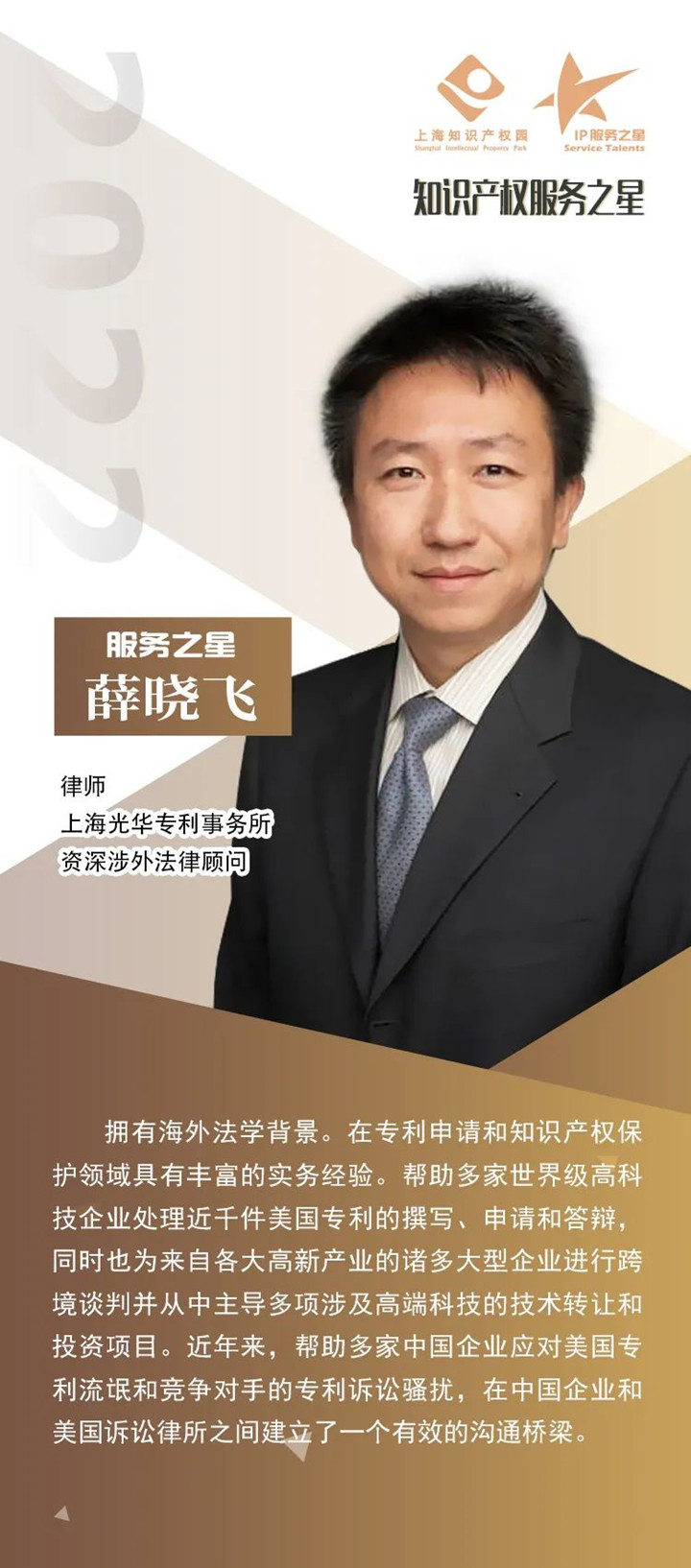 近日,由《上海知識產權》雜志評選的第六屆編輯推薦獎獲獎名單出爐,上海光華專利事務所薛曉飛律師榮獲“2022 知識產權服務之星”。