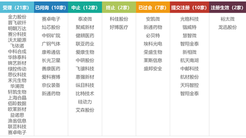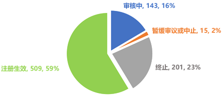 截止到2023116日,科創板共計申報企業868家。其中注冊生效509家(上市502家),終止(包括終止、終止注冊、不予注冊)201家,審核中(包括已受理、已問詢、上市委會議通過、提交注冊)143家,暫緩審議或中止15家。