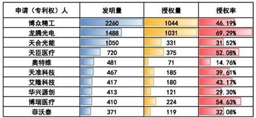 發明專利申請量前三的專利授權率,龍騰光電授權率最高,達69.49%,博眾精工為46.19%,天合光能為31.52%,天合光能授權率較另外兩家低的原因與撤回、駁回以及審中的專利較多有關。