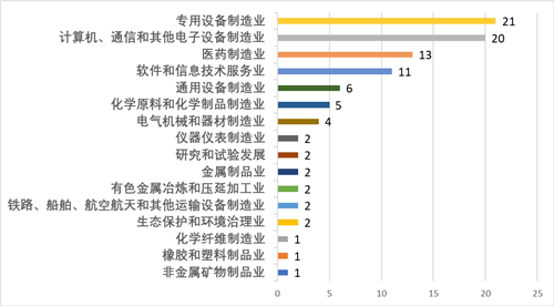 江蘇省成功上市的企業中,排名前三的行業/技術領域分別為:專用設備制造業21家)、計算機、通信和其他電子設備制造業20家)以及醫藥制造業(13家)。