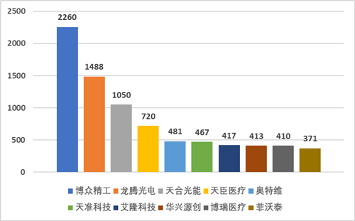 科創板對上市企業有著“科創屬性”的要求,具體又有著發明專利數量的要求。我們針對江蘇省上市企業專利數據進行了分析:從發明專利申請量排名來看,博眾精工發明專利申請量最多為2260件,高出第二位700多件;龍騰電光發明專利申請量1488件,排列第二;天合光能發明專利申請量889件,位列第三。