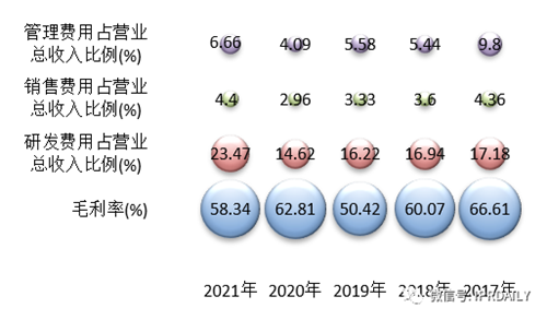 眾所周知,技術壁壘所帶來的高額利潤,必然是非制冷紅外探測器研發投資的持續動力。以下根據睿創微納(688002.SH)、大立科技(002214.SZ)、高德紅外(002414.SZ)三家上市公司的年報數據,得出近5年的毛利率普遍在50%以上,個別年份可達60%以上。從各費用占比看,其研發費用大多為其他費用占比的2倍。可見具有高技術壁壘的高科技公司,為了保持公司的技術優勢,進一步提升公司的技術實力,提高競爭力,也必須在研發上持續高投入。具體數據見圖 1、圖 2、圖 3。