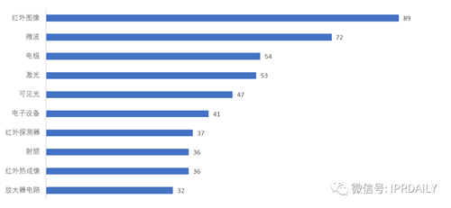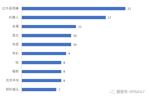 通過技術主題研究,見圖5,發現其專利最多的主題是紅外探測器,共有21件。其他主要的技術主題多為紅外系統的硬件層面,有關紅外圖像處理的偏軟件層面的專利卻只見到5件,足見大立科技的研發主要還是專注于硬件層面,產品定位于探測器芯片、機芯等紅外系統的前端設備,后端應用層面的圖像處理著力較少。可見這家企業的主要客戶,需要的紅外圖像為圖像原始數據,各種圖像處理工作還是由紅外成像儀的用戶來做,這也是典型的軍方用戶的需求。