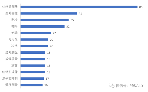 在檢索到的專利里,一共發現85件專利和制冷探測器相關,占比12.6%。高德紅外的制冷探測器技術從2010年開始有個別專利申請;到2020年有13件專利申請,首次突破了10件;再到2022年制冷型探測器技術相關專利申請呈現井噴,共有40件專利申請,由于專利公開的滯后性,相信未來2年內仍然會有2022年申請的專利被公開。這種制冷探測器技術專利申請的趨勢說明,高德紅外近年來正在加速進行軍工技術的民用轉化進程。