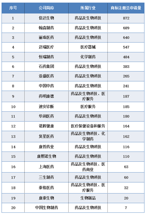特別注意的是,競(jìng)爭(zhēng)力位居榜首的信達(dá)生物的商標(biāo)申請(qǐng)總量達(dá)到872枚。緊隨其后的是瀚森制藥,商標(biāo)申請(qǐng)總量為689枚;麗珠醫(yī)藥,商標(biāo)申請(qǐng)總量為640枚。