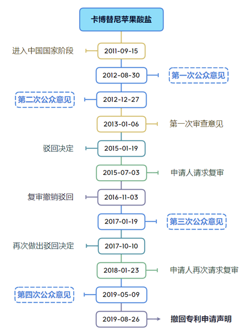該案所涉及的技術方案為卡博替尼蘋果酸鹽及其晶型,是美國企業Exelixis研發的癌癥治療藥物。縱觀此案的時間線,可以得知,公眾意見不僅出現在專利申請的常規審查過程中,在該案收到首次駁回決定后,申請人提出的兩次復審請求過程中,公眾也在持續關注該案的審查進展,并且補充提交了“第三次公眾意見”、“第四次公眾意見”。最終,該案申請人在與公眾進行了激烈較量后,目前是駁回失效狀態。