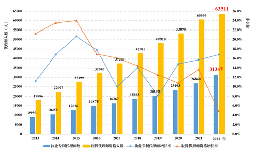 2013-2022年執業專利代理師及取得專利代理師資格人數變化情況
