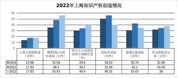 2022年,上海專利授權量17.83萬件,其中發(fā)明專利授權量3.68萬件,同比增長11.98%;PCT國際專利申請量為5591件,同比增長15.76%。截至年底,上海有效發(fā)明專利擁有量20.20萬件,同比增長17.43%;每萬人口高價值發(fā)明專利擁有量達到40.9件,較上年度增長6.7件。上海商標申請量40.31萬件,新增商標注冊量35.07萬件,截至年底,上海有效商標注冊量達242.75萬件,同比增長14.66%。上海作品版權登記數(shù)突破38萬件,同比增長10%。上海共擁有地理標志商標18件,地理標志產(chǎn)品8個。上海獲得農業(yè)植物新品種授權31項,林業(yè)植物新品種授權9項。上海在世界知識產(chǎn)權組織(WIPO)發(fā)布的《全球創(chuàng)新指數(shù)報告》“最佳科技集群”中的排名由2021年第8位上升至第6位(與蘇州合并為同一科技集群)。