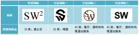 下面通過一個案例具體說明美國商標(biāo)的近似判斷。申請商標(biāo)SW2被美國審查員判定為與三件在先商標(biāo)構(gòu)成近似商標(biāo),申請人未答復(fù)審查員的審查意見,商標(biāo)申請被駁回[3]。