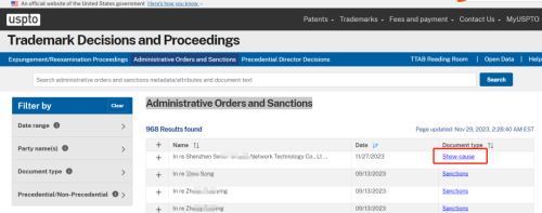 近期,2023年11月27日,USTPO再次發(fā)布了“Supplemental Show Cause Order”(補(bǔ)充舉證指令),延續(xù)了上次的調(diào)查。USTPO搜集了更多證據(jù),本次涉及53,205個(gè)商標(biāo),文件多達(dá)1319頁。此次懲戒,美國(guó)商標(biāo)局還專門列出了這些商標(biāo)代理公司的中文名稱。文件鏈接如下:https://developer.uspto.gov/tm-decisions/search/administrative