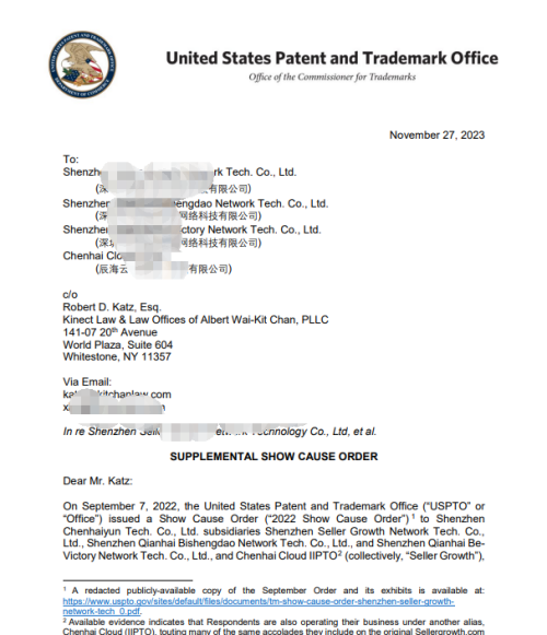繼去年9月,美國(guó)商標(biāo)局針對(duì)深圳某公司發(fā)出了“Order to Show Cause”(陳述理由指令),長(zhǎng)達(dá)600多頁的文件詳細(xì)描述了商標(biāo)注冊(cè)違規(guī)行為。事件涉及13,000多個(gè)商標(biāo)被撤銷。