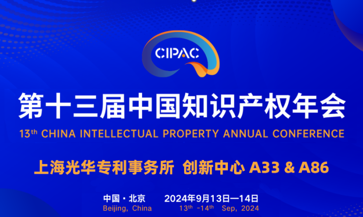 第十三屆中國知識產(chǎn)權(quán)年會(CIPAC)將于9月13日至14日在北京中關(guān)村國際創(chuàng)新中心及中關(guān)村國家自主創(chuàng)新示范區(qū)展示中心舉辦。今年,上海光華專利事務(wù)所將在北京中關(guān)村國際創(chuàng)新中心的A33及A86展位設(shè)立展臺,接待與會嘉賓,提供專業(yè)的知識產(chǎn)權(quán)咨詢服務(wù),誠邀您的光臨!