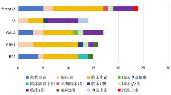 進(jìn)一步對AAV基因治療藥物相關(guān)靶點(diǎn)進(jìn)行分析。在研藥物針對的排名前5名的抗原靶點(diǎn)依次為Factor IX、F8、GALA、GBA1以及RP4。Factor IX是AAV基因治療藥物研究最火熱的靶點(diǎn)。