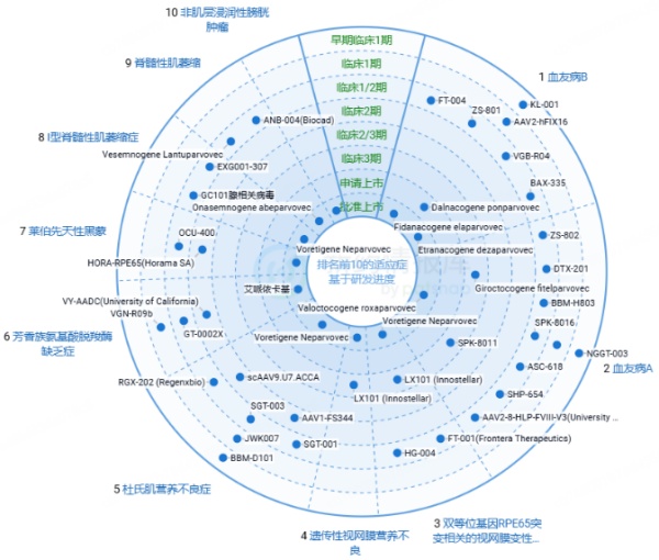 圖四 AAV基因治療藥物適應(yīng)癥及研發(fā)階段