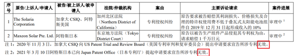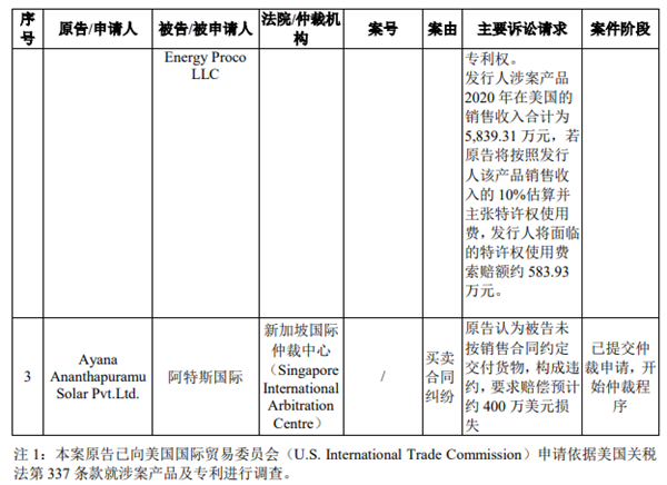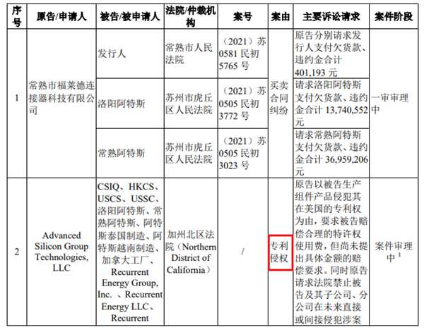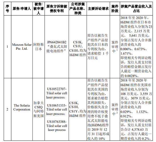 基于注冊制強調信息充分披露的大背景下,早在申報之時,阿特斯就在招股說明書中主動披露發行人及其控股子公司存在尚未了結的或可預見的涉及專利侵權糾紛的訴訟、仲裁案件共 2 起(截止2020年12月31日),具體情況如下: