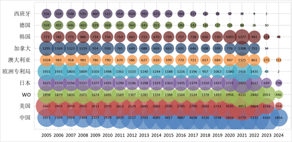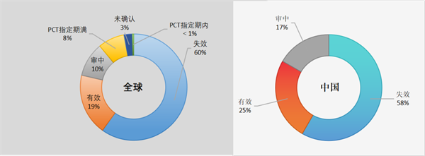 全球專利申請失效專利占比偏大,授權有效和審中專利占比較小,目前的創新趨勢不高。PCT專利申請在10%以下,全球專利流通一般。回看中國,失效專利占比與全球一致,審中和有效專利占比都有一定提高,結合前述申請趨勢,可見中國在該領域技術發展相對全球平均水平更活躍。