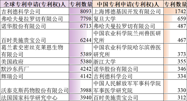 抗病毒藥物領域全球專利申請總量排名前十的申請人均為國外公司。中國專利申請總量排名前十的申請人中,2所中國高校、3個科研院所、4家國外公司,僅有1家是中國公司(上海博德基因開發有限公司)。上海博德基因開發有限公司和復旦大學位列中國專利申請人前兩位。
