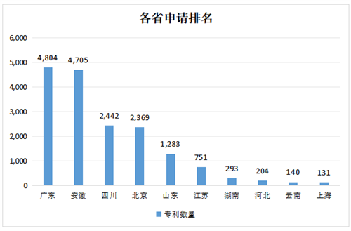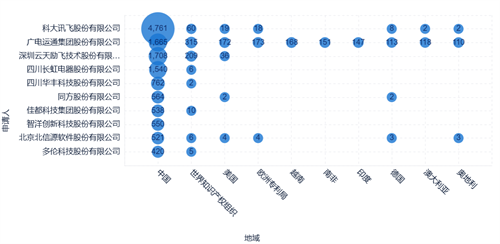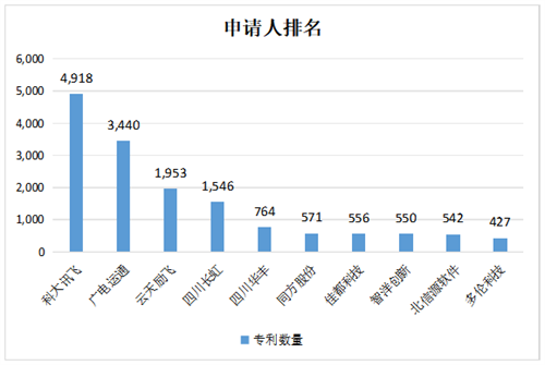從各省市排名來看,廣東省的專利申請量排名第一,其次是安徽省。廣東的創新實體主要有廣電運通、云天勵飛等,安徽的創新實體主要是科大訊飛(包含共同申請)。