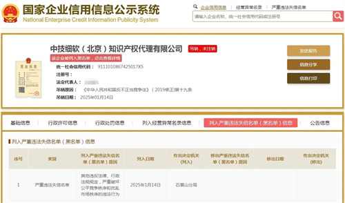 某知識產權平臺因行賄商標審查人員,旗下兩家關聯公司分別于2025年1月9日和1月14日被吊銷執照,直接被列入嚴重違法失信名單。