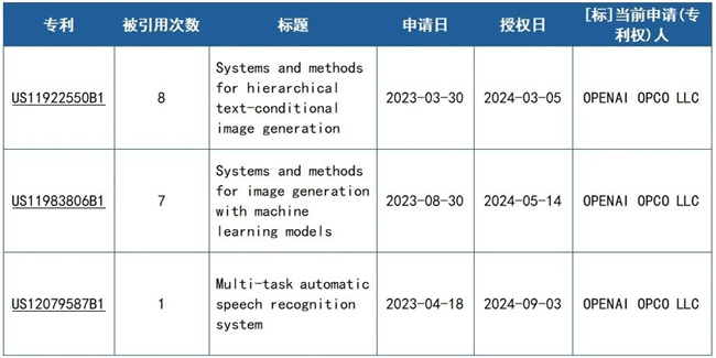 專利被引用次數是一個非常好的指標,其可以識別哪些專利技術已被廣泛應用,并且說明有很多研發人員已經借鑒過這些技術。被引用次數越多的專利,其影響力越大,甚至可以代表該技術領域的核心創新技術。據統計,OPENAI有以下3篇專利被引用,這3篇專利,都是2023年申請的,并都于2024年獲得授權。可以預見,隨著各國 GenAI 相關應用技術的發展,將會有更多OPENAI 申請的基礎專利被引用。