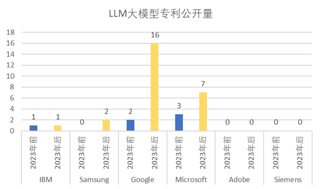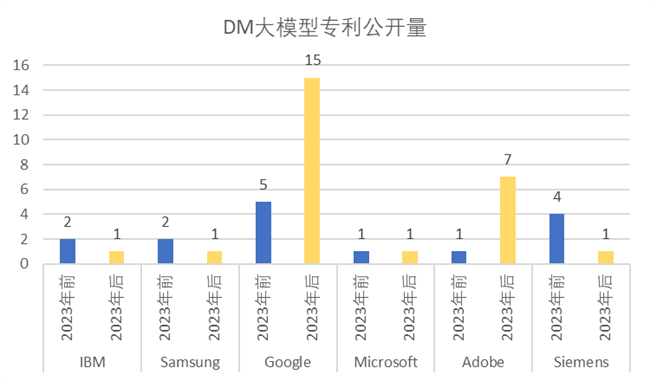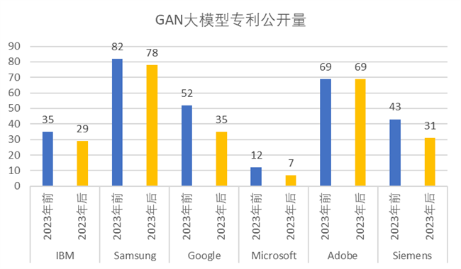 我們研究了《WIPO報告》里面排名靠前的美國公司IBM、Google、Microsoft、Adobe、以及GAN申請量非常多的德國知名企業Siemens和韓國SamSung。通過研究這幾個排名靠前的國外知名公司在ChatGPT發布前后(即2023年前后)的相關專利公開量,并且根據GenAI各主要大模型加以梳理,形成以下柱狀圖,直觀地展示了IBM、SamSung、Google、Microsoft、Adobe、Siemens 等公司,于2023年前后在GAN,VAE,LLM,AE,DM 大模型上相關專利公開量。