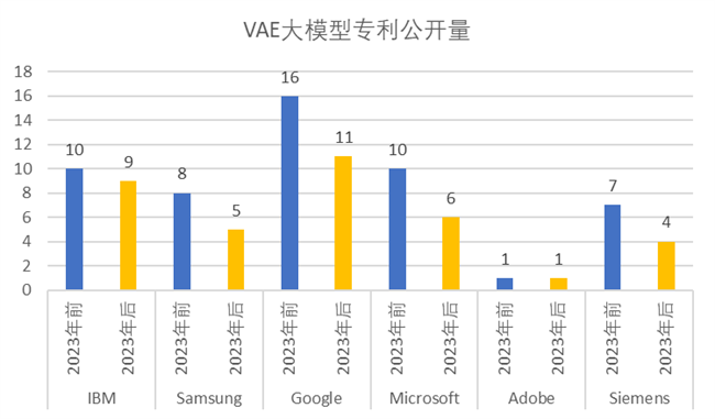 從各大公司的 GAN、VAE、AM 大模型相關專利的申請情況來看,2023年后的專利申請量沒有明顯的爆發性上升,這個情況和三個大模型在總體上受到 ChatGPT 發布的影響較小的結論是一致的。