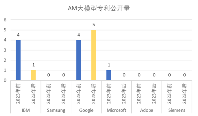 從總體上而言,AM 大模型相關專利一直只有零星的申請量。落實到各大知名公司上,僅有Google公司在2023年前后都有相關專利申請;IBM公司在2023年后的相關專利申請明顯下降;其他知名國外公司則在 AM 大模型上未見相關專利申請。可以預見,若沒有新應用場景的涌現,AM大模型相關專利將延續現在的零星的申請量,甚至將不會有研發實體再繼續這方面的應用研究投入。