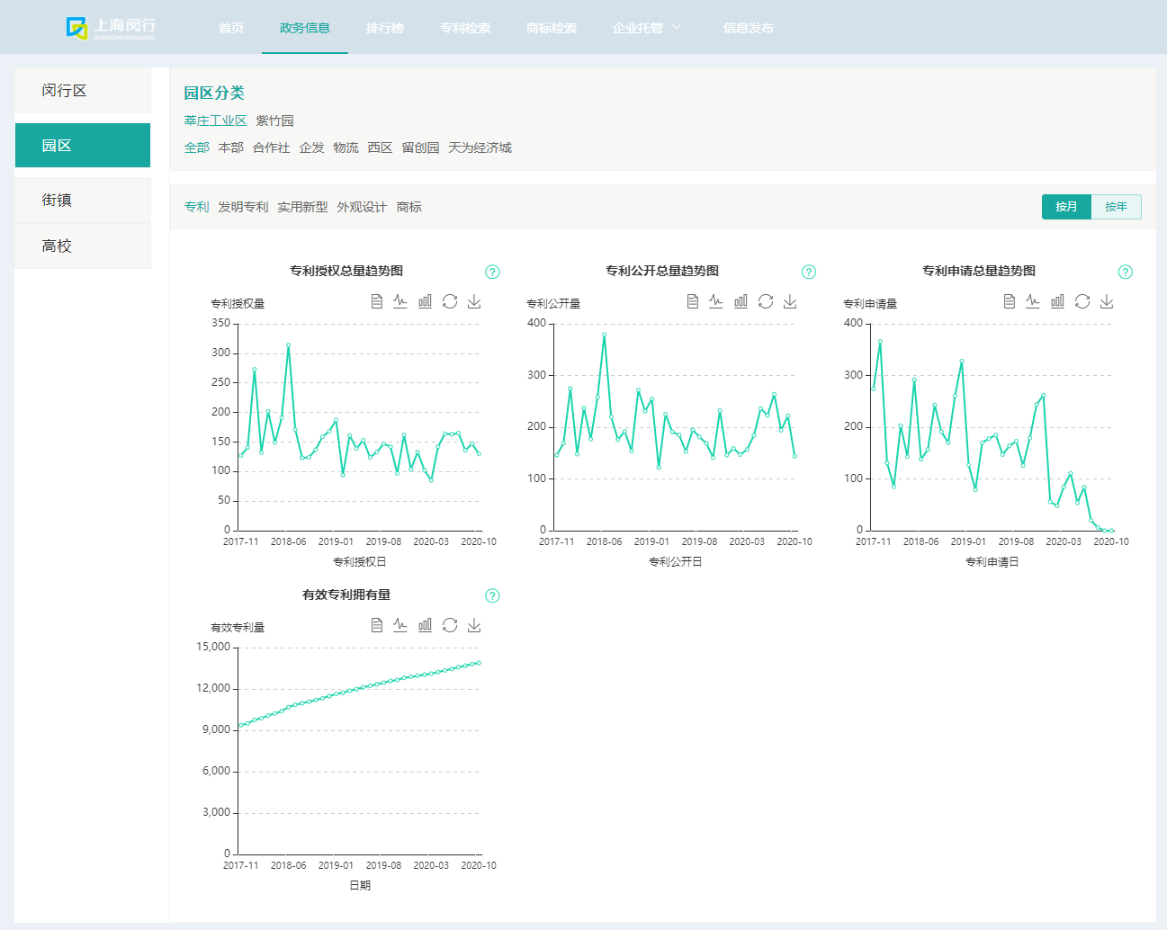 園區知識產權管理平臺包括“園區實時監控統計”“知識產權信息統計”“企業排行榜”“企業托管服務”“專利檢索”“商標檢索”六大功能模塊,真正做到了對園區企業的全覆蓋,園區管理通過對知識產權信息實時監控管理,實現了對本園區科技、經濟情況的全面管控。